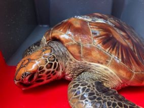 Arrivée au centre de soins des tortues marines fin septembre 2022 avec une plaie ouverte de la carapace due à une hélice de bateau, l’état de santé de HERE était très préoccupant. Ses organes internes et notamment ses poumons étaient visibles à travers la plaie.